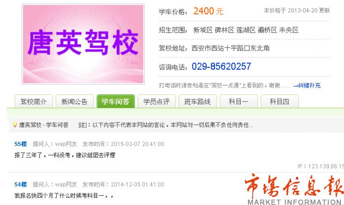 希望这样的事情能引起驾管科的重视,把学员的利益放在首位。也希望西安唐英驾校以认真负责的态度对待每一位学员,不要等到失去信誉时才知晚矣。成女士资料过期不能领取驾照的事情该如何解决,对此,市场信息报将继续关注。