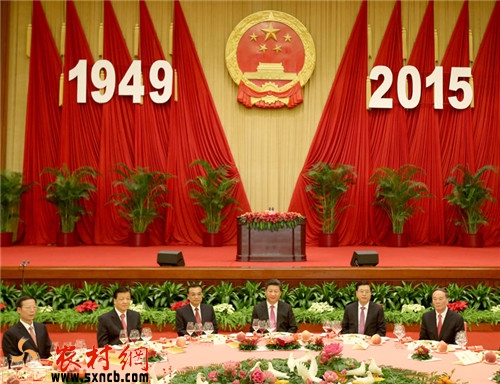 人民大会堂宴会厅内华灯璀璨、鲜花绽放,宾朋济济一堂,气氛喜庆热烈。主席台上方国徽高悬,“1949-2015”的大字年号熠熠生辉,鲜艳的红旗分立两侧。