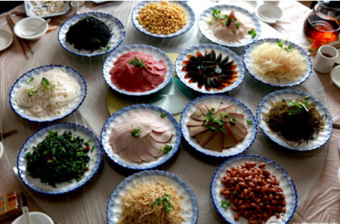 顶盘,按照每家的习惯各有不同,但必须是采用煮熟的鸡蛋或者橘子等圆形食材来表示圆满。再加上寓意团圆美满的丸子、象征清清白白光明磊落的白菜烩豆腐,盘盘碗碗的菜如鲜花般一起摆在桌子上,“金丝十三花”就正式开席了。