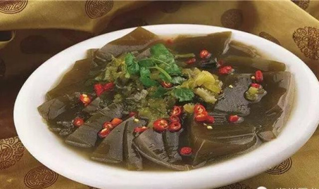 如果说“金丝十三花”展现了商南人的热情好客,而更多菜肴,则是这里的人们心灵手巧的最好体现。神仙叶树,忍冬科植物,学名叫做二翅六道木,这种叶子与桑叶非常相似的植物在金丝峡地区背阴的山坡上很容易见到。取新鲜嫩叶,用滚沸的开水烫熟浸泡,之后用手使劲揉搓,放在筛子里,使粘稠的浆液流入盆中。经过一段时间的冷却后,神奇的事情发生了,刚才的液体凝结成了块状,商南人称其为神仙凉粉。