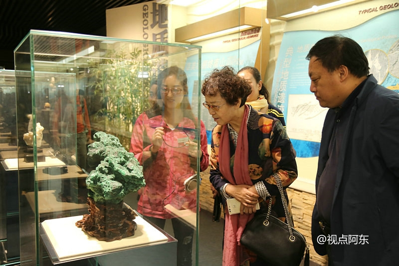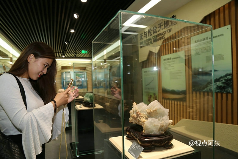 一位游客被秦岭终南山世界地质公园博物馆陈列的石头所吸引