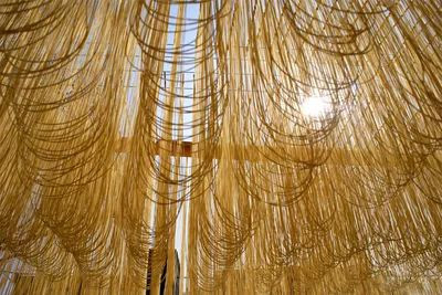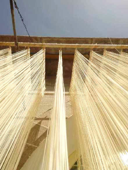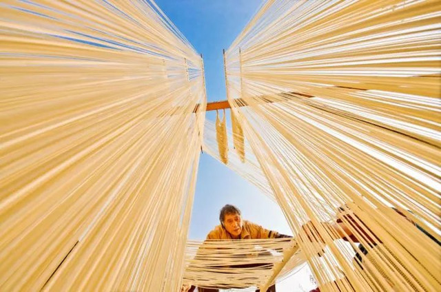 当我们在晾晒棚下看到那一行行悬垂的挂面是那么纤细、匀称、笔直,不由得感叹这真的是一种生活的艺术、祖先的智慧。