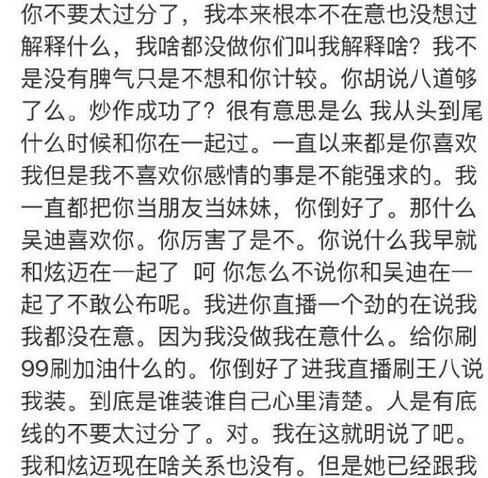 最开始的时候是这样的,孙晨和思萌分手之后孙晨总是在极力的为自己找借口,然后又骂了思萌,后来思萌发视频说了一些话,这些话中证实了两人在一起的经过,并且晒出了很多聊天记录,这些聊天记录让我们知道了很多事情,但是后来孙晨又发视频说思萌的聊天记录是伪造的,后来思萌开直播把聊天记录中的语音放出来了,所以双方的撕逼大战开始了,这边孙晨有三桂力挺,那边思萌有晶哥,然后双方就在直播中涂鸦骂对方,再后来思萌现任男友吴迪要孙晨道歉!