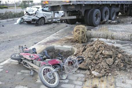 当日下午5时许,事故现场凌乱不堪,白色的小车已面目全非,甚至难以辨别车辆品牌。目击者称,当时小车由西向东行驶,大货车由南向北行驶,两辆车速度都比较快,虽然互相躲避对方,但还是撞了上去。大货车是辆没有载重的空车,撞车后向右侧偏转,压过绿化隔离带、撞歪路灯后,冲上辅道又压上了人行道,一位在路边坐在电动车上的男子被卷入车轮下。