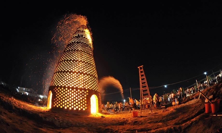 中秋夜烧塔在江西吉安地区很盛行。据传烧塔也是元朝末年,汉族人民反抗残暴统治者,于中秋起义时举火为号的由来。塔高1—3公尺不等,多用碎瓦片砌成,大的塔还要用砖块砌成,约占塔高的1/4,然后再用瓦片叠砌而成,顶端留一个塔口,供投放燃料用。中秋晚上便点火燃烧,燃料有木、竹、谷壳等,火旺时泼松香粉,引焰助威,极为壮观。