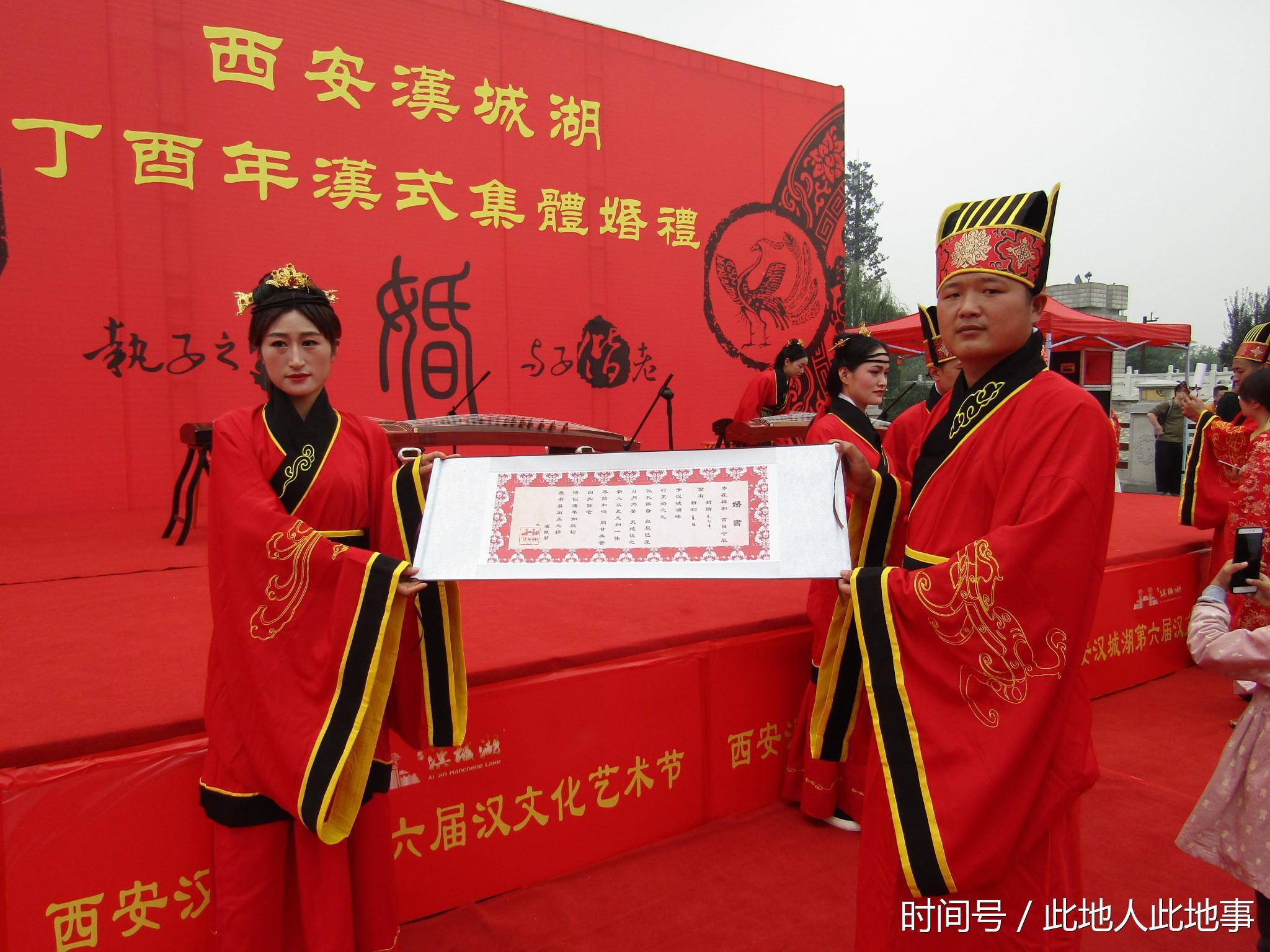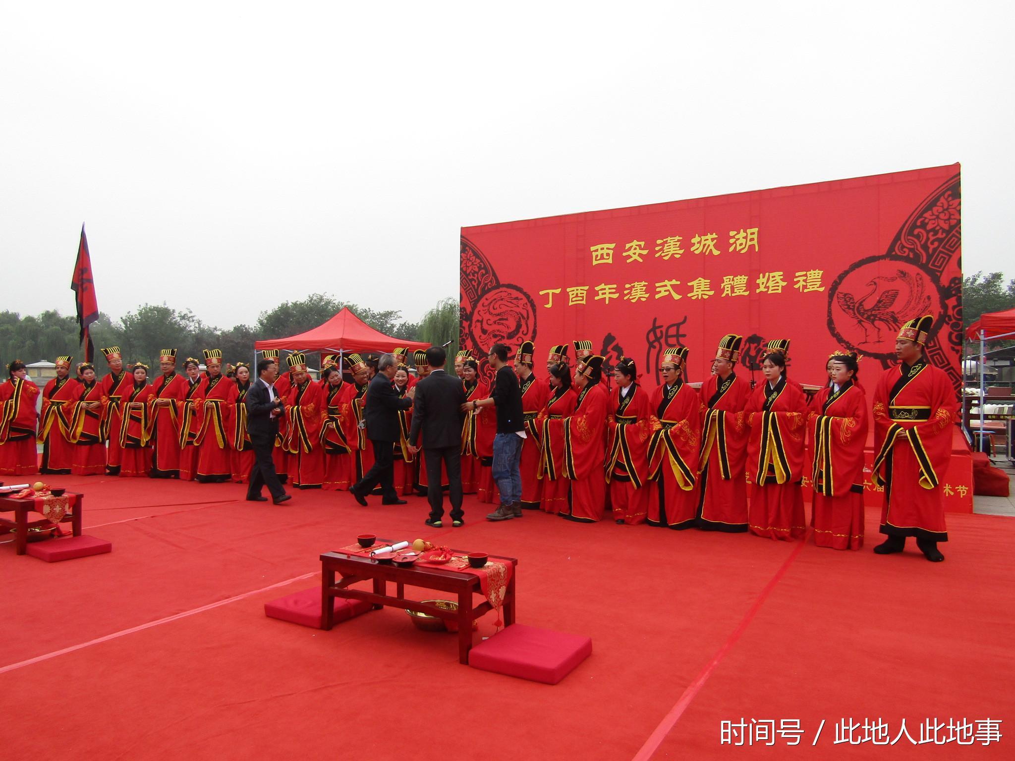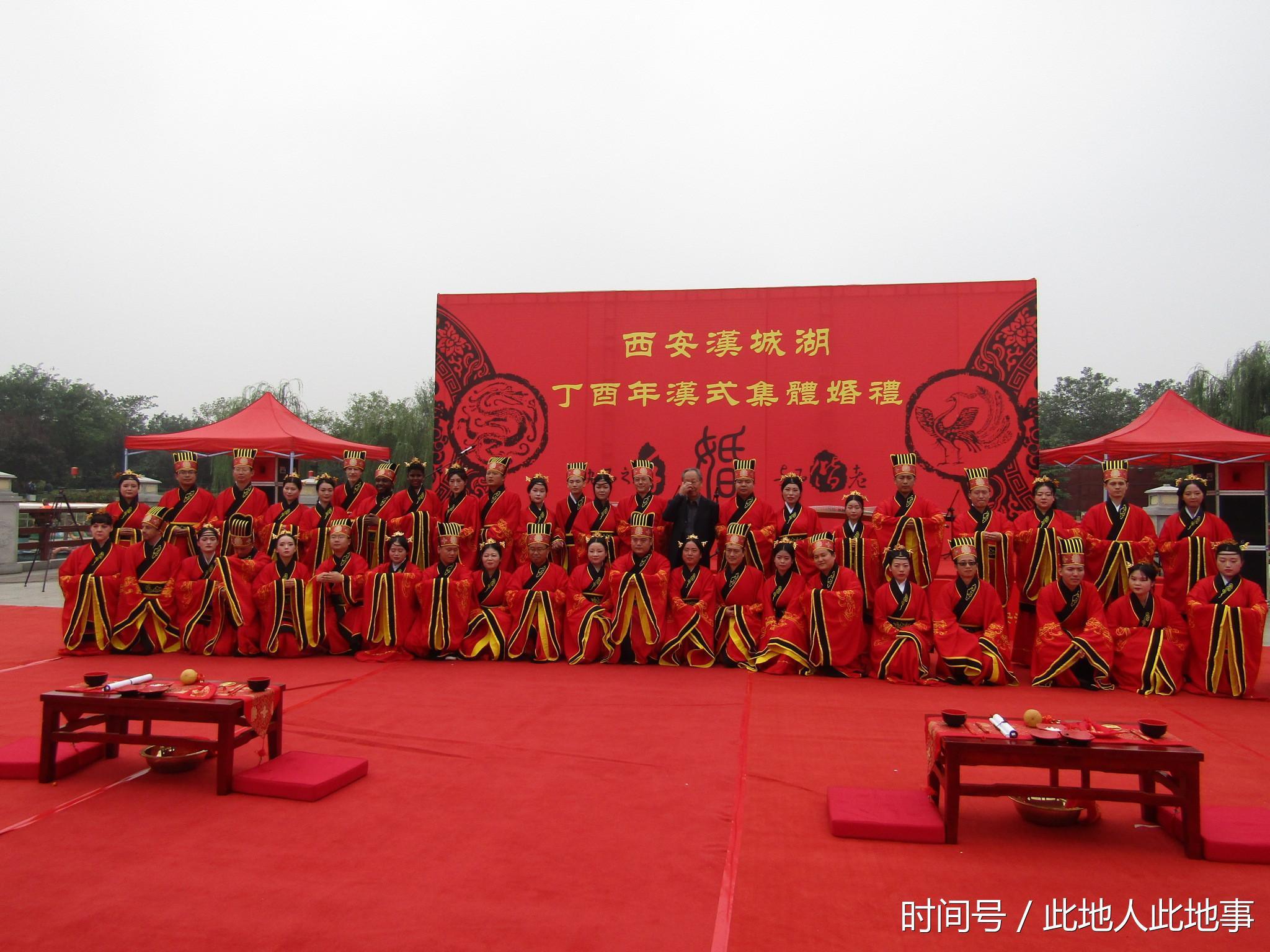 10月2日,西安30对新人在汉城湖举办复古集体婚礼。新郎和新娘身穿唐式婚礼服举行了新人对席、读婚书、新人结发新人合卺、新人拜堂等仪式,真实再现了汉朝盛典婚礼。