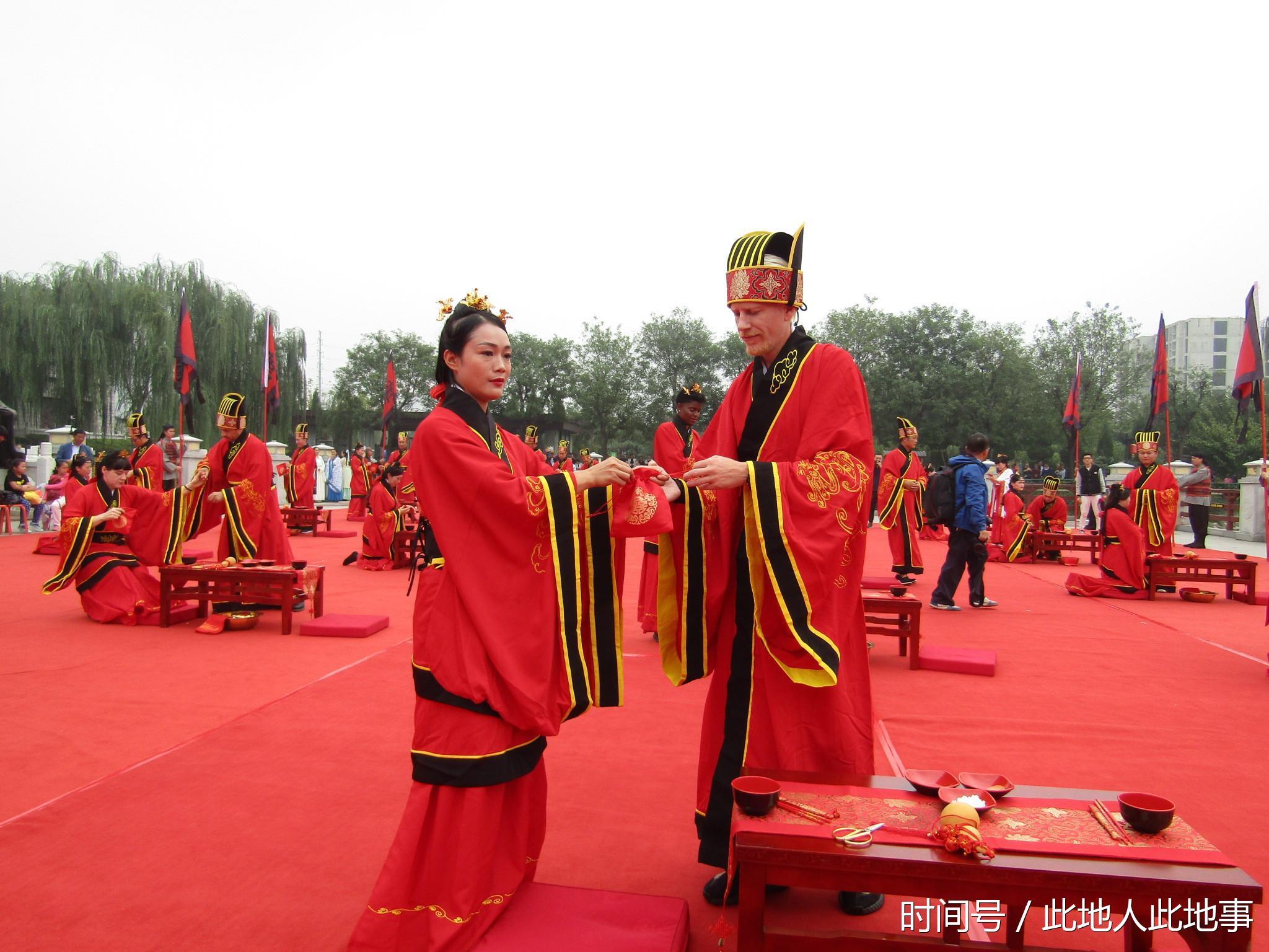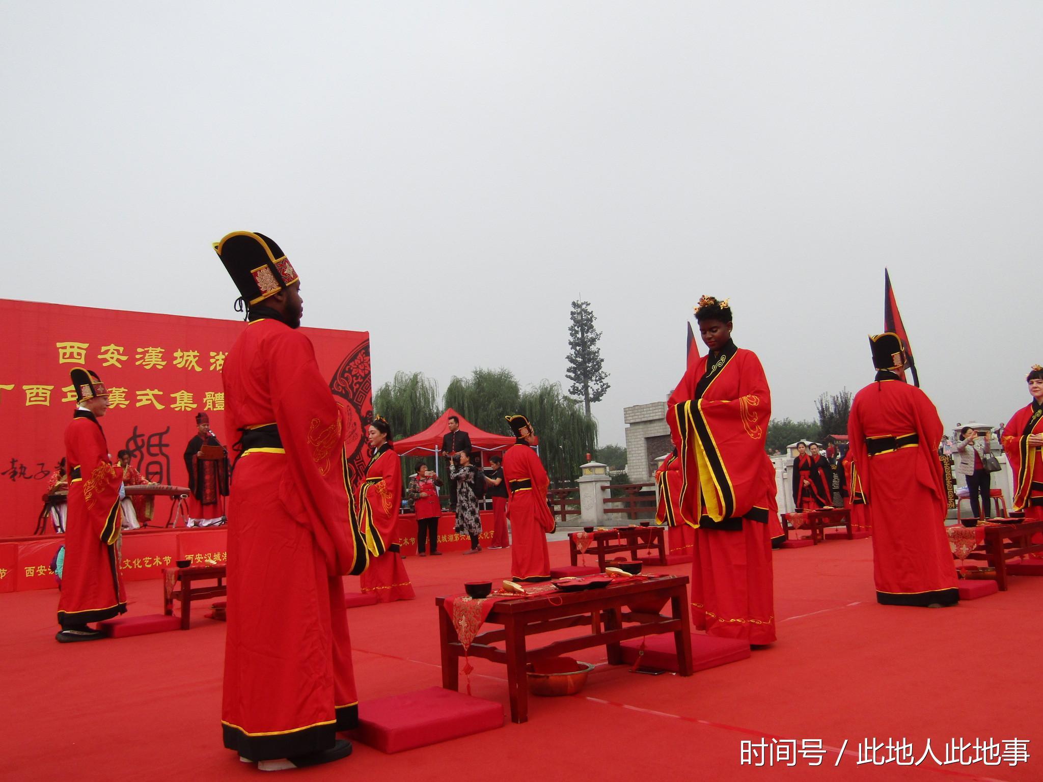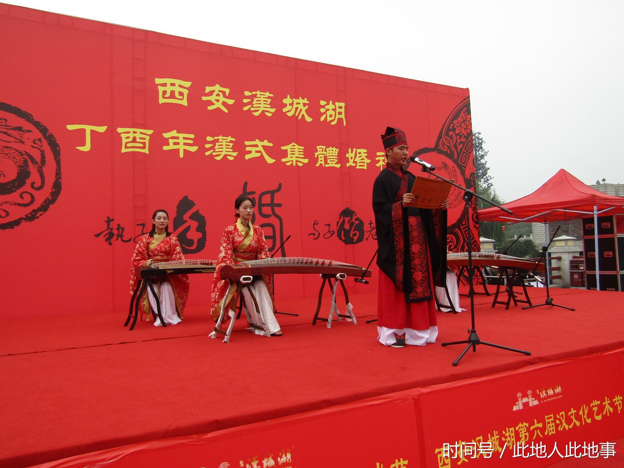 10月2日,西安30对新人在汉城湖举办复古集体婚礼。新郎和新娘身穿唐式婚礼服举行了新人对席、读婚书、新人结发新人合卺、新人拜堂等仪式,真实再现了汉朝盛典婚礼。