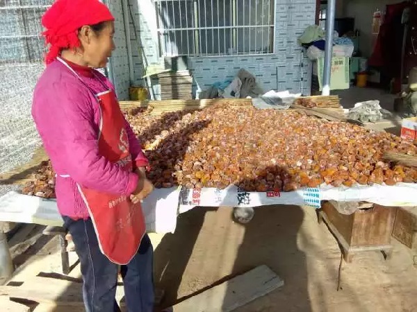这个季节,在农村柿子倒也很常见,一个一个,红得像灯笼,甜透了你的相思,而你相思的那份柿饼在这里。这就是广阳镇水利村丁小龙的家里。放眼而去,一串一串,轻轻摇曳,一旁,他们忙碌着。