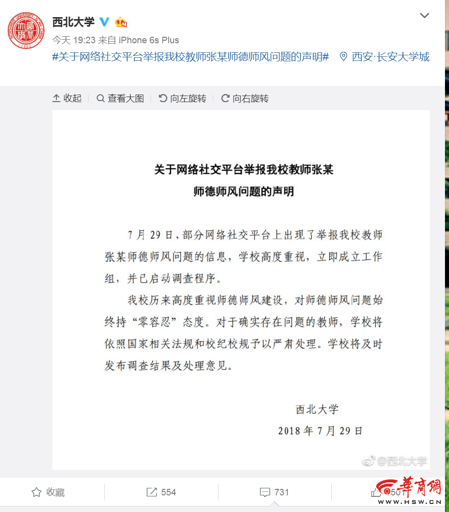 西北大学最新回应:涉事教师张晓、田霖被调离工作岗位